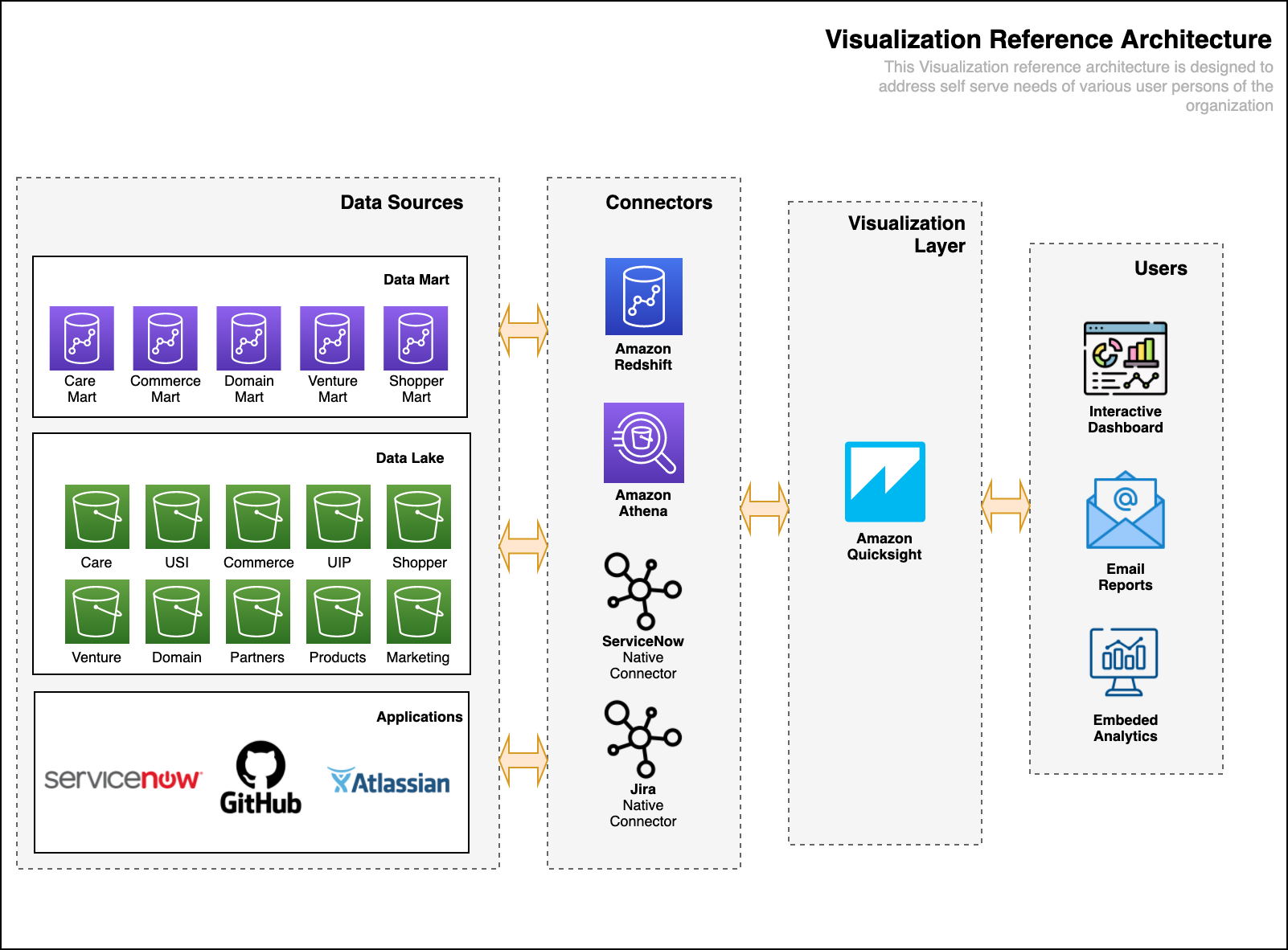 QuickSight pulls data from several different systems, including Amazon Redshift, Amazon Athena, and ServiceNow. It delivers full visibility across our disparate data sets: data marts, data lakes, and applications are all connected through QuickSight. Creating SPICE (Super-fast, Parallel, In-memory Calculation Engine) datasets provides consistently fast performance, no matter how many concurrent users are connected to the application. The datasets are refreshed periodically ensuring users access to recent data.