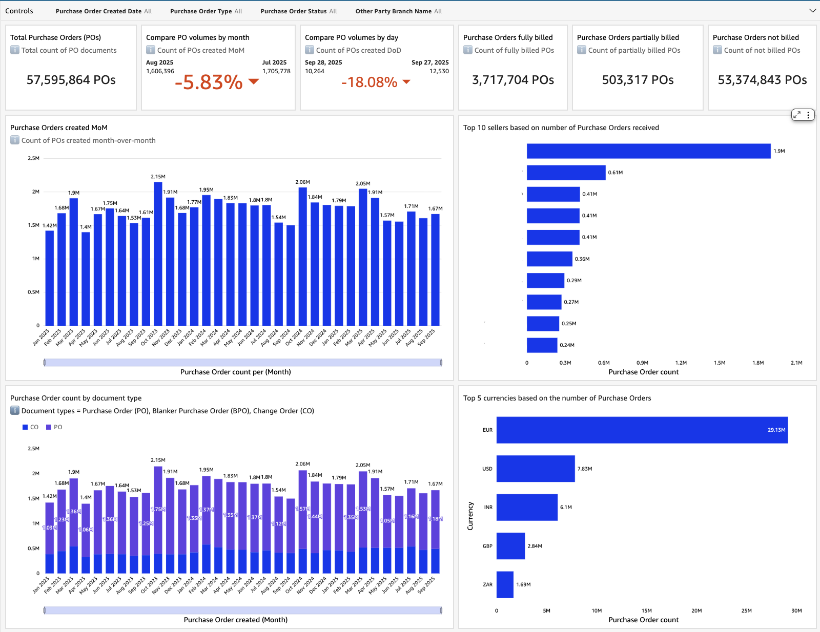 For our buyer customers, we’ve implemented a comprehensive suite of 11 ready-made reports and dashboards that address key business needs. The following screenshot illustrates the dashboard showing the Tradeshift purchase orders (PO) lifecycle.