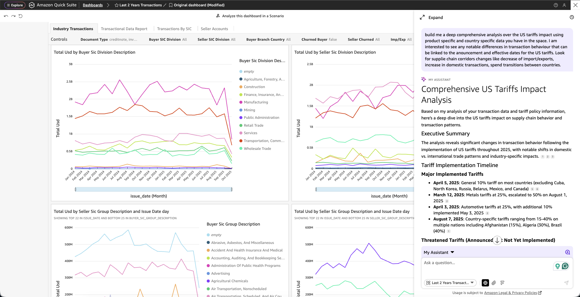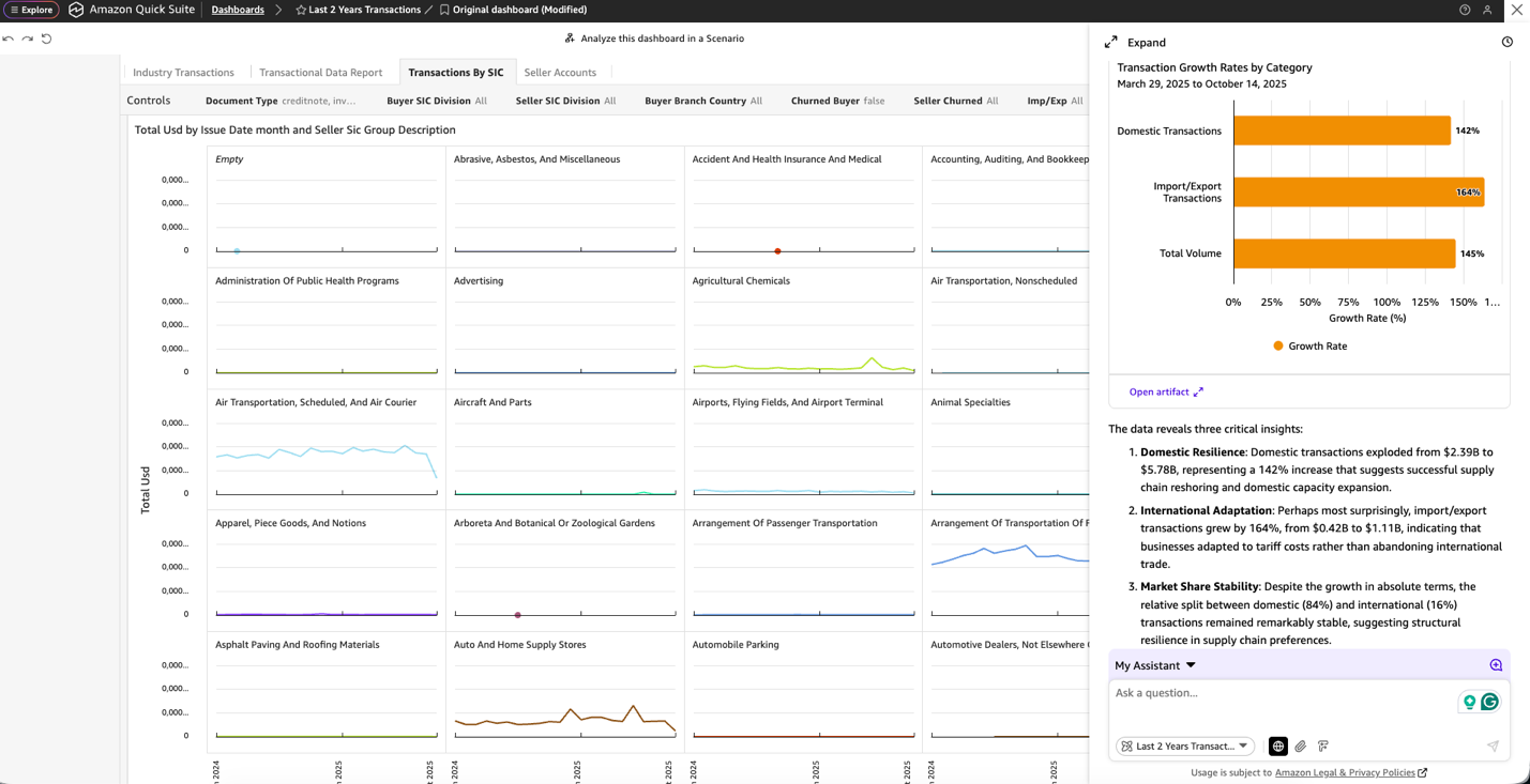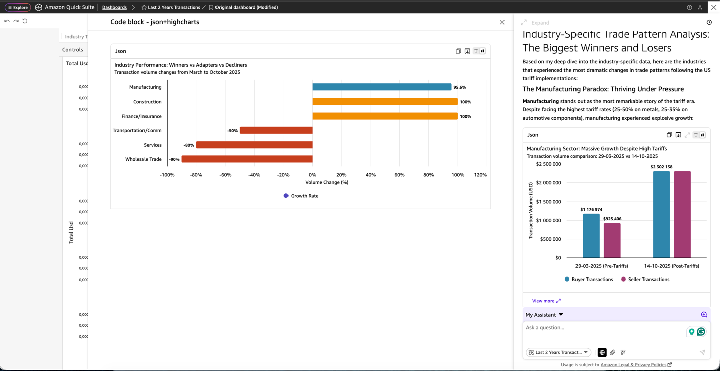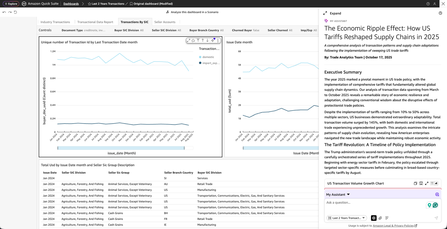 In addition to the aforementioned embedded analytics, the Quick Suite chat agent has revolutionized how we develop our Global Index Report, transforming our ability to analyze complex market dynamics and their impact on Tradeshift’s business operations. This powerful tool seamlessly integrates internal platform data and external market information, providing comprehensive insights that would traditionally require extensive manual analysis and cross-referencing. A prime example of this capability was demonstrated in our recent analysis of US tariffs’ impact on global commerce, as shown in the following screenshots. The chat agent efficiently processed our internal transaction data while incorporating relevant external economic indicators, delivering a nuanced understanding of market shifts. The tool not only conducted deep data analysis but also automatically generated polished executive summaries, effectively communicating complex findings to stakeholders.
