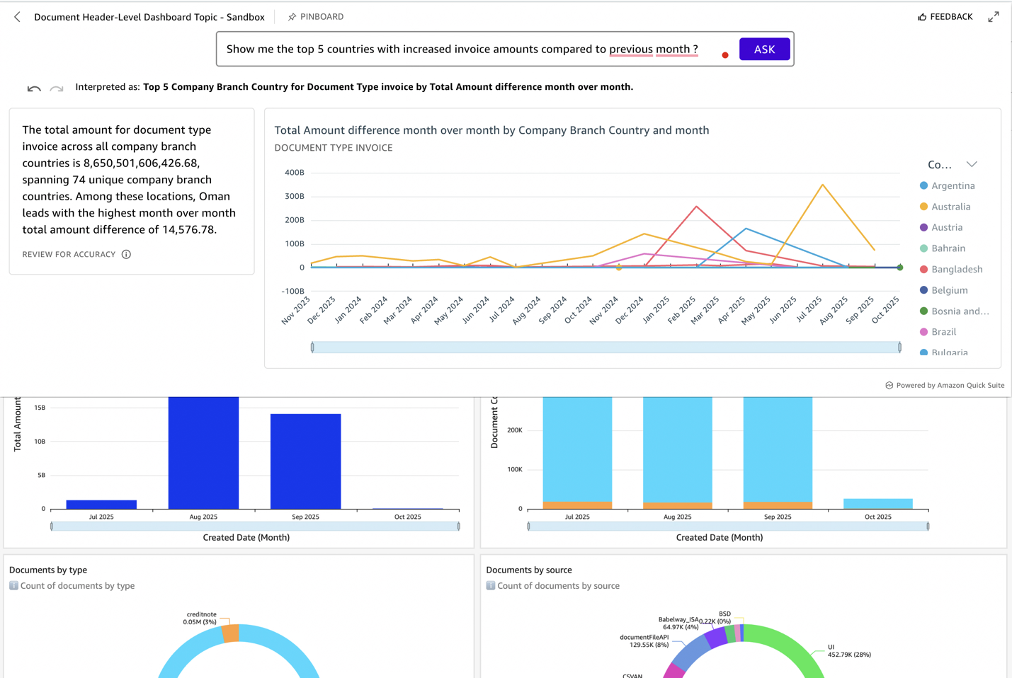By providing granular visibility into document-level data, the dashboard enables efficient payment processing, cost optimization, and informed business decisions, making it an invaluable resource for financial operations management The document analytics dashboard provides buyers with real-time visibility into their transaction flows. Using Amazon Q, buyers can quickly analyze spending patterns with queries such as “What is my total spend by supplier category in Q3?” This has enabled more strategic sourcing decisions and better cash flow management.