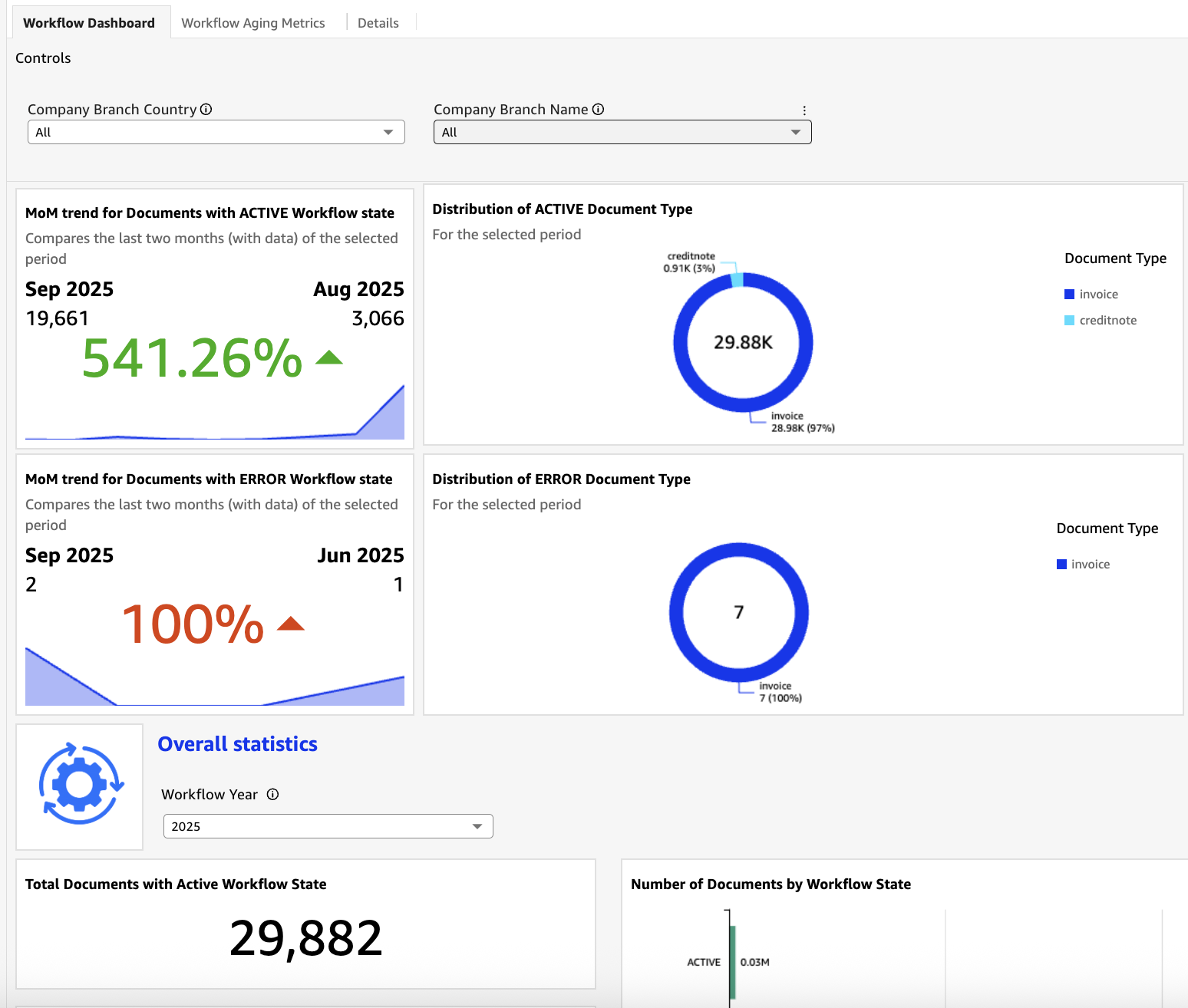 This capability has helped our buyers reduce processing times by identifying bottlenecks and optimizing workflows. The workflow report and dashboard (shown in the following screenshot) provides comprehensive monitoring of document progression through Tradeshift’s predefined workflow stages. It tracks critical performance indicators, including workflow status, document aging, approval statistics, approver activities, automated processing rates, and error frequencies.