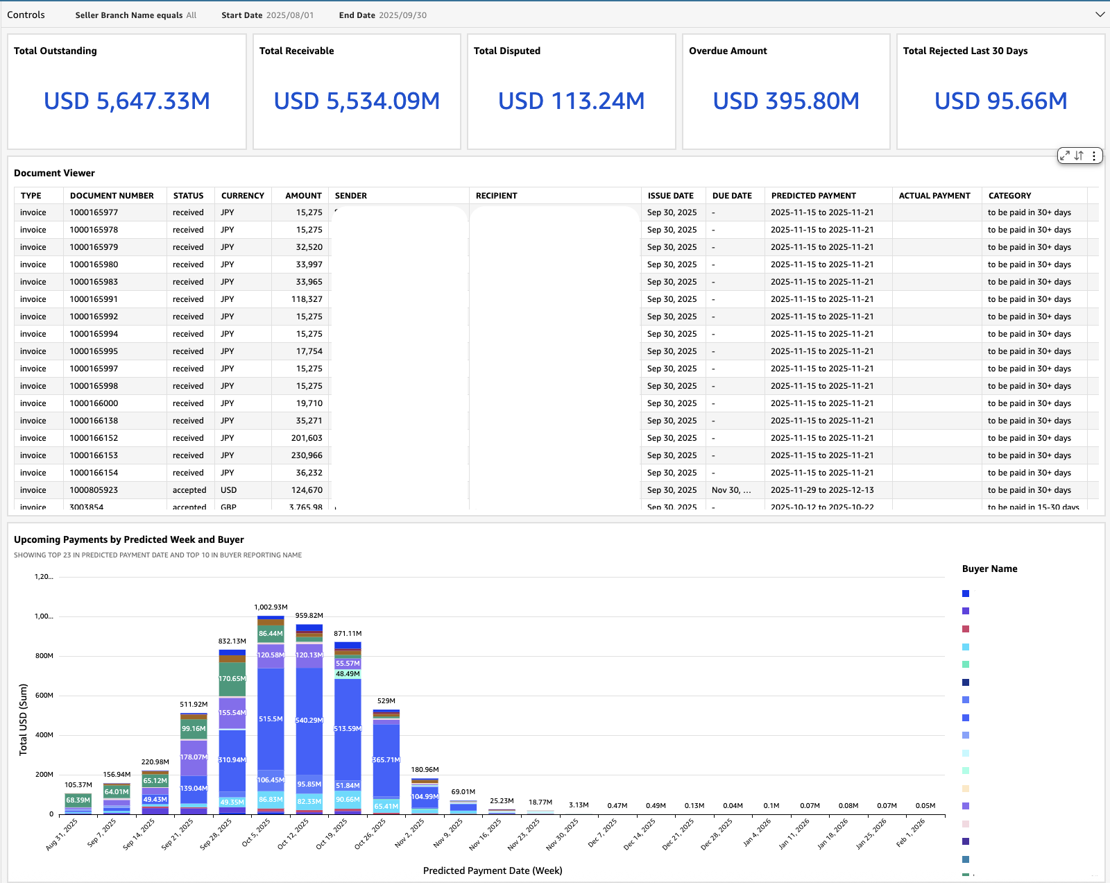 The payment prediction analytics system combines historical payment data with actual invoice information to generate accurate forecasts of future payment patterns. By using advanced machine learning (ML) algorithms, the system analyzes multiple variables, including customer payment behaviors, historical transactions, and market conditions to predict payment outcomes. This predictive capability enables businesses to proactively manage their cash flow, minimize financial risks, and optimize their payment strategies for improved operational efficiency. The following screenshot shows an example of how the dashboard displays predicted payments-related metrics.