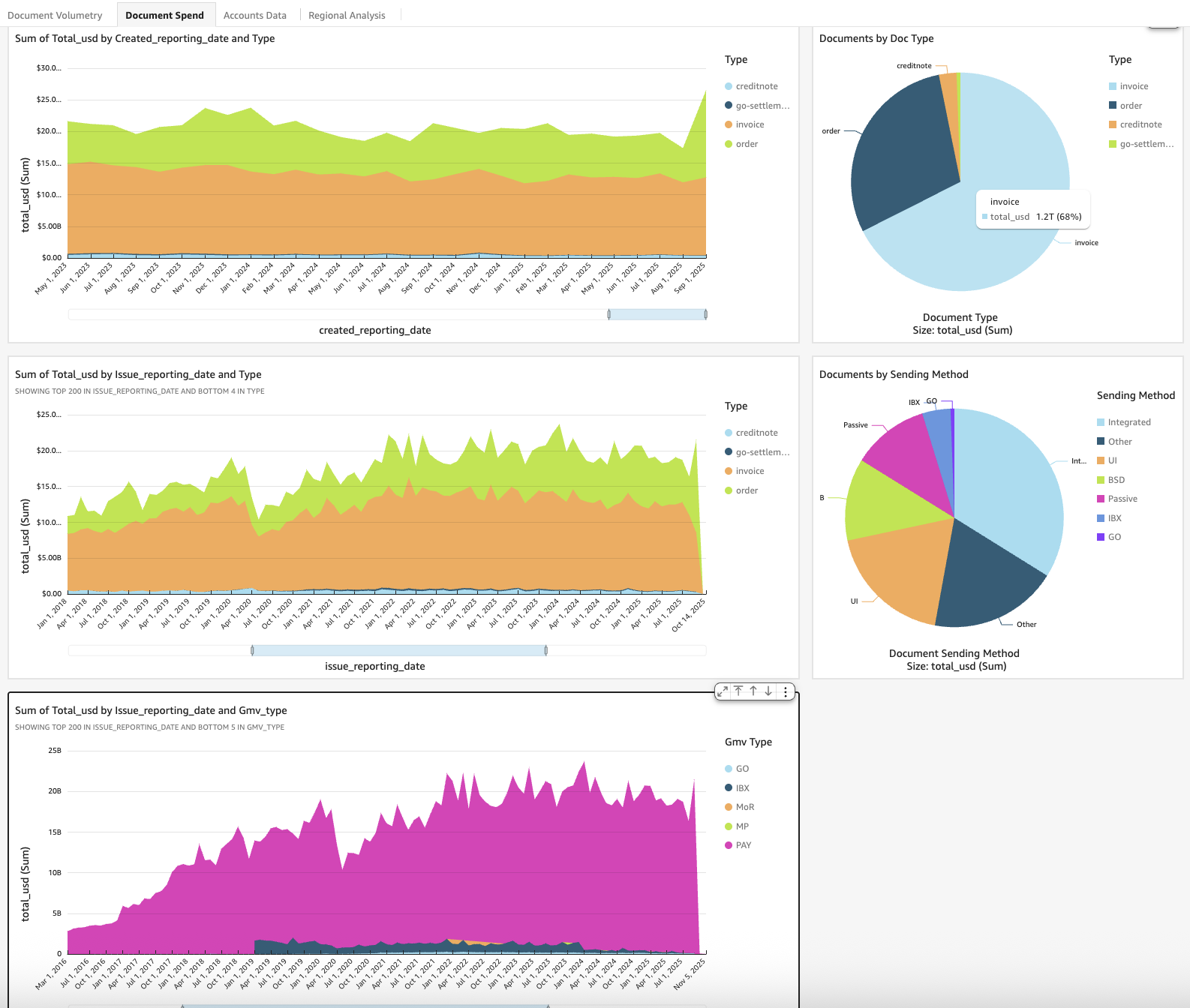 Through detailed analytics of these workflow metrics, customers can identify bottlenecks, optimize approval processes, and enhance operational efficiency. The dashboard’s ability to maintain detailed audit trails of document handling supports process improvement initiatives and makes sure regulatory compliance requirements are met. The document header-level report and dashboard (as shown in the following screenshot) functions as a detailed tracking system for individual documents processed through the Tradeshift platform. This comprehensive tool captures essential transaction details, including unique document identifiers, monetary values in both local and USD currencies, tax information, accounting references, and cost center allocations.