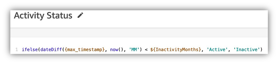 - Create calculated fields – For instance, you can create a calculated field to detect the active or inactive status of QuickSight users. If the time span between the latest view dashboard activity and now is larger or equal to the number defined in the Inactivity Months control, the user status is Inactive. The following screenshot shows the relevant code.