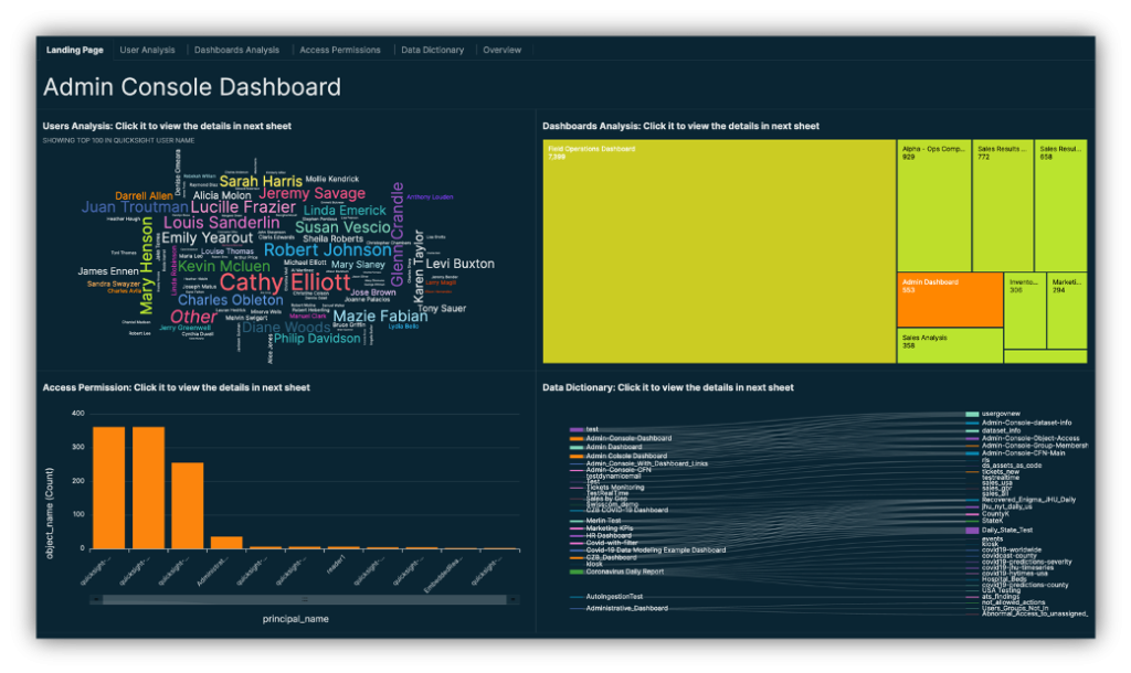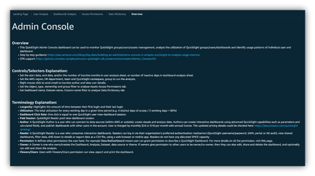 In this post, we introduce the latest Admin Console, an AWS packaged solution that you can easily deploy and use to create a usage and inventory dashboard for your QuickSight assets. The Admin Console helps identify usage patterns of an individual user and dashboards. It can also help you track which dashboards and groups you have or need access to, and what you can do with that access, by providing more details on QuickSight group and user permissions and activities and QuickSight asset (dashboards, analyses, and datasets) permissions. With timely access to interactive usage metrics, the Admin Console can help BI leaders and administrators make a cost-efficient plan for dashboard improvements. Another common use case of this dashboard is to provide a centralized repository of the QuickSight assets. QuickSight artifacts consists of multiple types of assets (dashboards, analyses, datasets, and more) with dependencies between them. Having a single repository to view all assets and their dependencies can be an important element in your enterprise data dictionary.