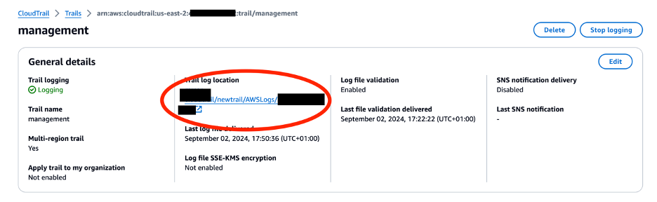 You can find the location of your CloudTrail logs in the CloudTrail management console: