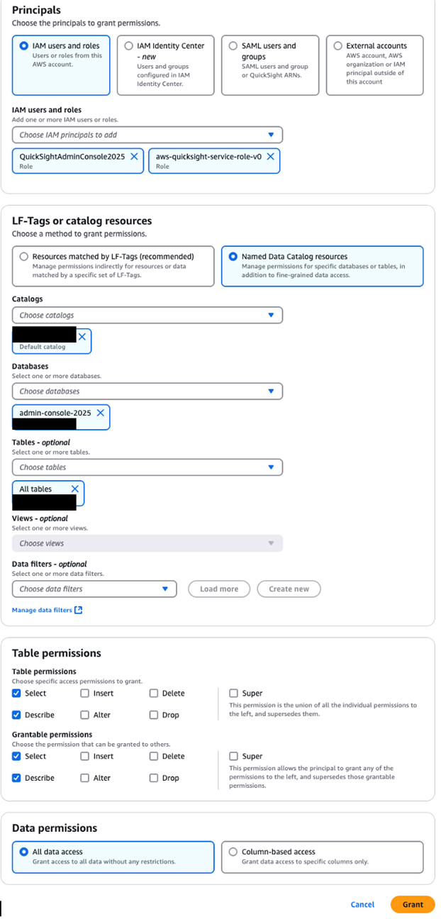 s3://admin-console-new-[AWS-account-ID]ands3://cloudtrail-awslogs-[aws-account-id]-do-not-delete(or the appropriate S3 bucket if you used a different name). - Go to AWS Lake Formation to grant the database and table access to QuickSight service role and the admin console execution role.