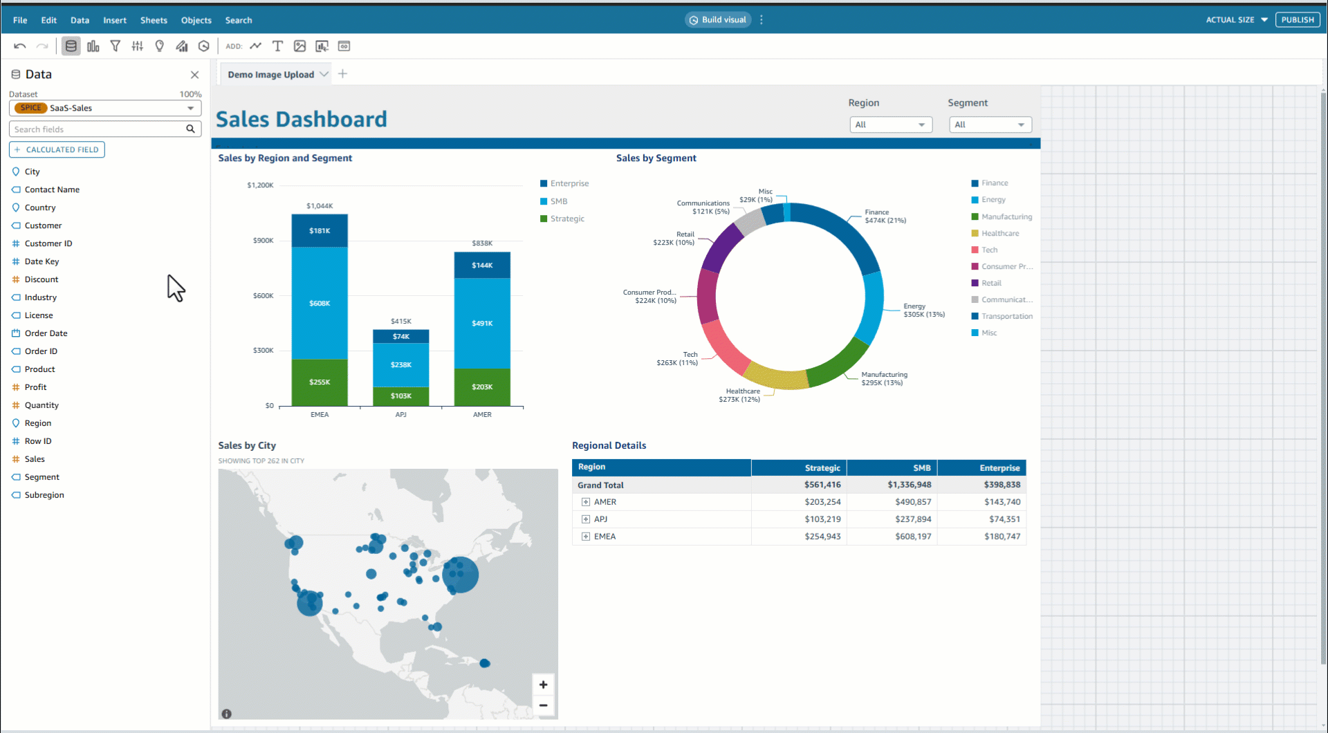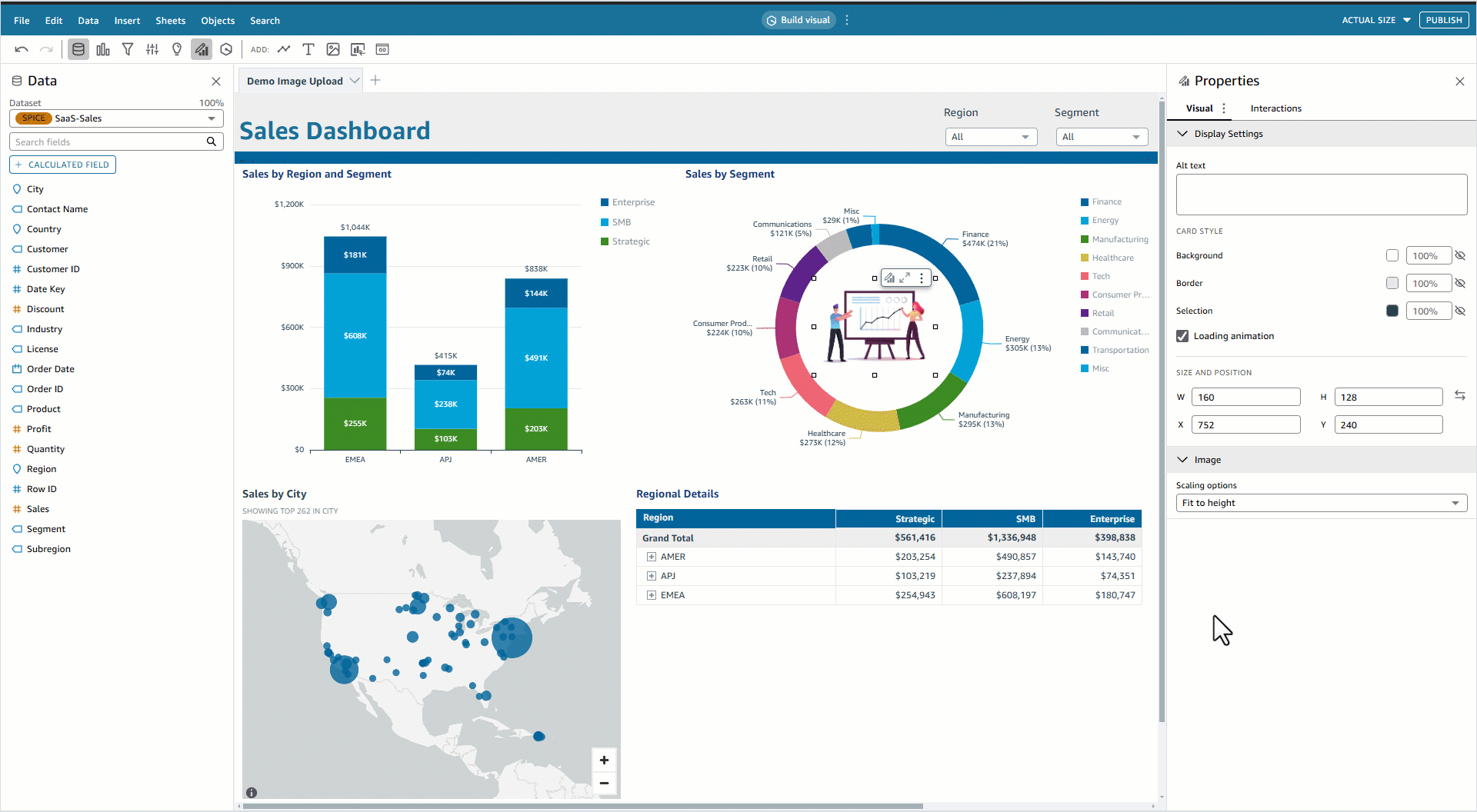 With this new image component, you can upload images directly from your local desktop to QuickSight for a variety of use cases, such as adding company logos and branding, including background images with free-form layout, and creating captivating story covers. It also supports tooltip and alt text, providing additional context and accessibility for readers. Furthermore, it offers navigation and URL actions, enabling you to make your images interactive, such as triggering specific dashboard actions when the image is clicked. With the new image component, QuickSight authors can now craft more engaging, brand-aligned, and interactive visual narratives, taking their dashboarding and data storytelling to new heights.