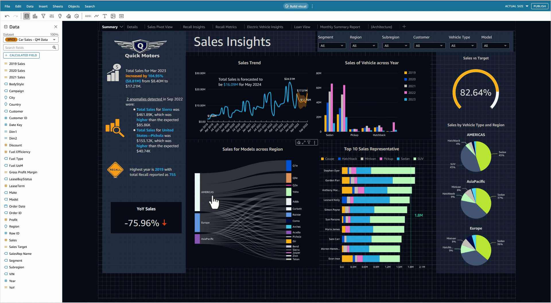 Amazon QuickSight powers data-driven organizations with unified business intelligence (BI) at hyperscale. As a fully managed, cloud-native business intelligence (BI) service, QuickSight transforms complex data into actionable insights that can be shared across your entire organization with just a few clicks. Bring your data stories to life through interactive visualizations and compelling dashboards that scale to thousands of users. Whether accessed directly through the service’s intuitive interface or seamlessly embedded in your applications and portals, these insights drive smarter, faster business decisions.