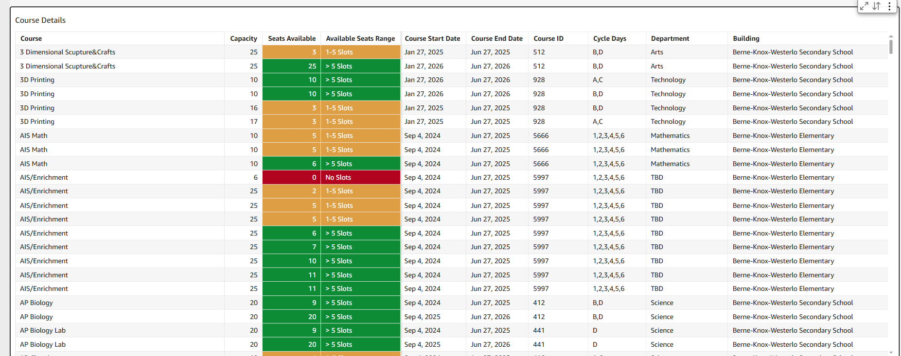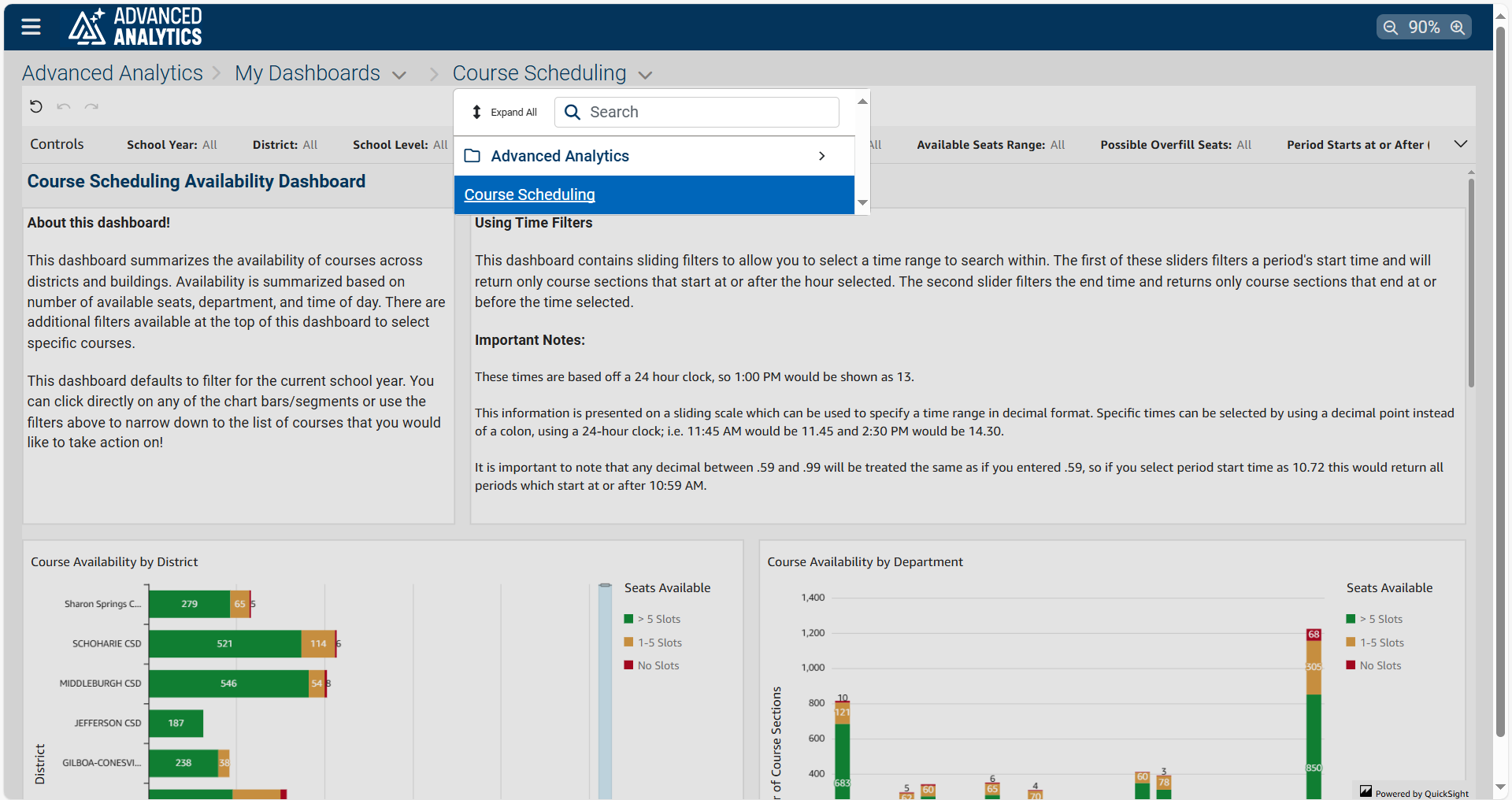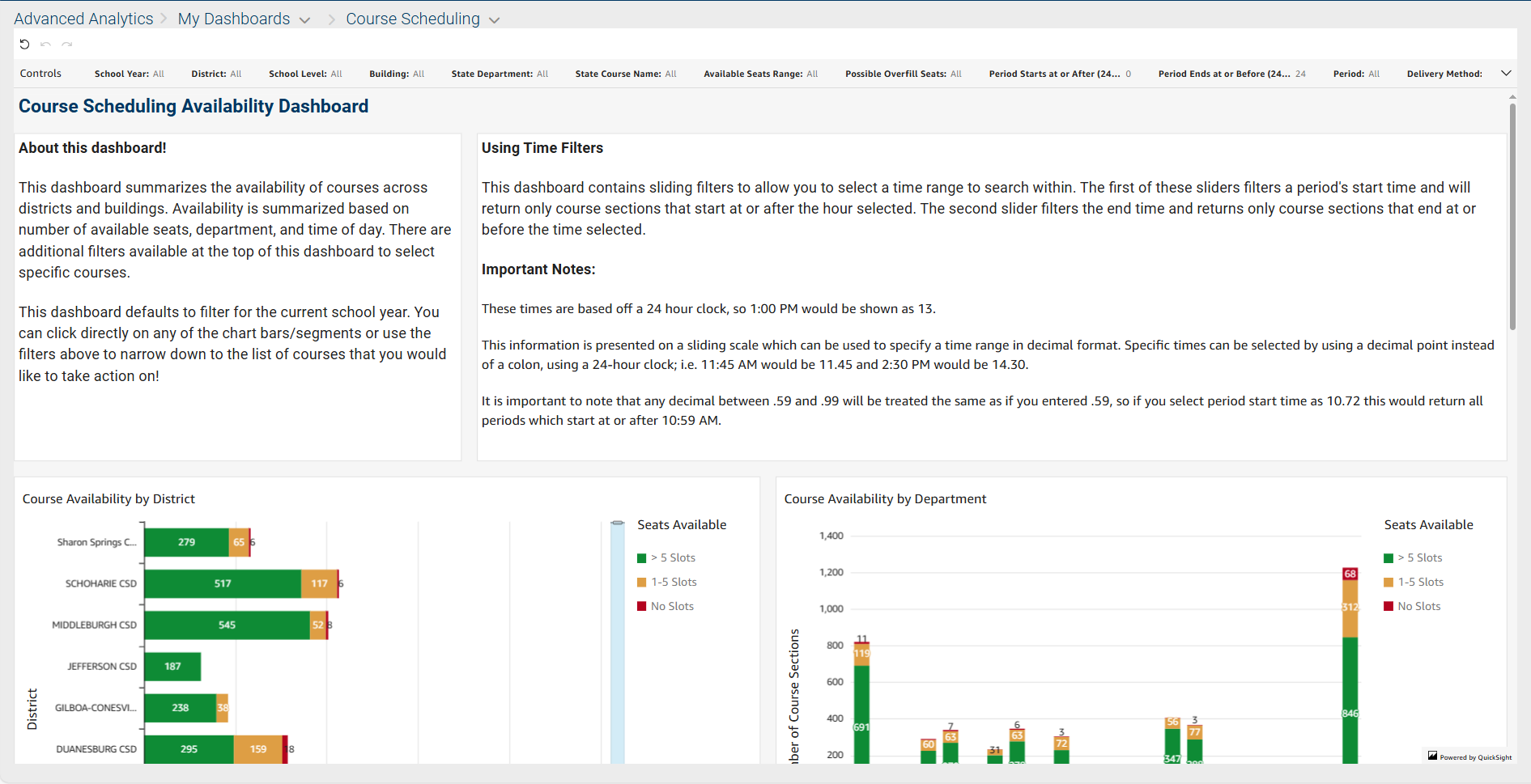 The Course Scheduling dashboard (see the following screenshots) provides an immediate overview of course availability across districts and buildings. The dashboard displays availability based on open seats, department, and time of day, with intuitive filters that allow users to quickly narrow their focus to specific courses of interest.