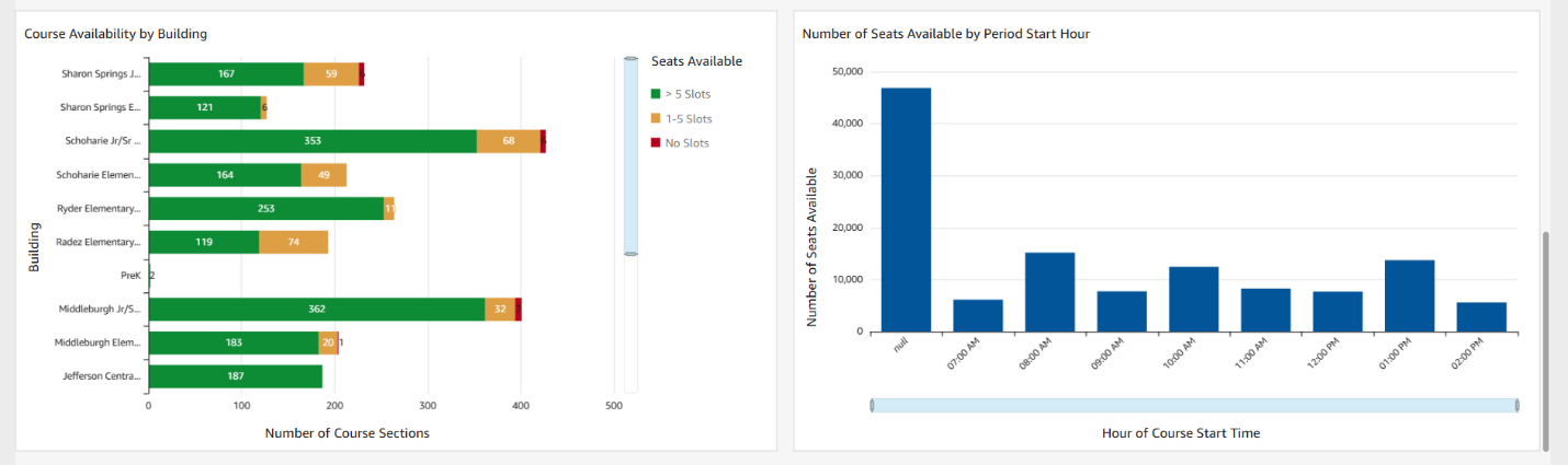 Additional visualizations show course availability by building, displaying the number of available seats at each location. This helps identify which buildings have the most or least course availability, allowing for better resource allocation and decision-making across the region. The dashboards update automatically each night, but we can modify the refresh frequency during peak periods of increased activity.