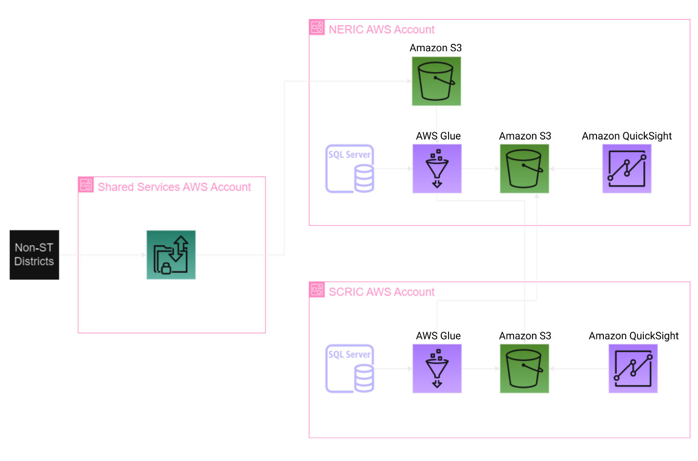 The architecture diagram shows two QuickSight instances because the data is stored in different AWS accounts for each RIC. Although users from different RICs might view the same shared data, they also need access to region-specific dashboards and information. By maintaining separate accounts, we can better control data access and make sure users only see the data relevant to their specific RIC or district.