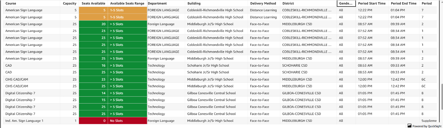 The following dashboard shows an example where a student wants to take American Sign Language (ASL), which is not offered at their local school. By using the scheduling dashboard, the counselor can see that ASL is offered at two neighboring schools, virtual or in-person, and what times the ASL class is offered, so they can immediately see what works with the student’s schedule.