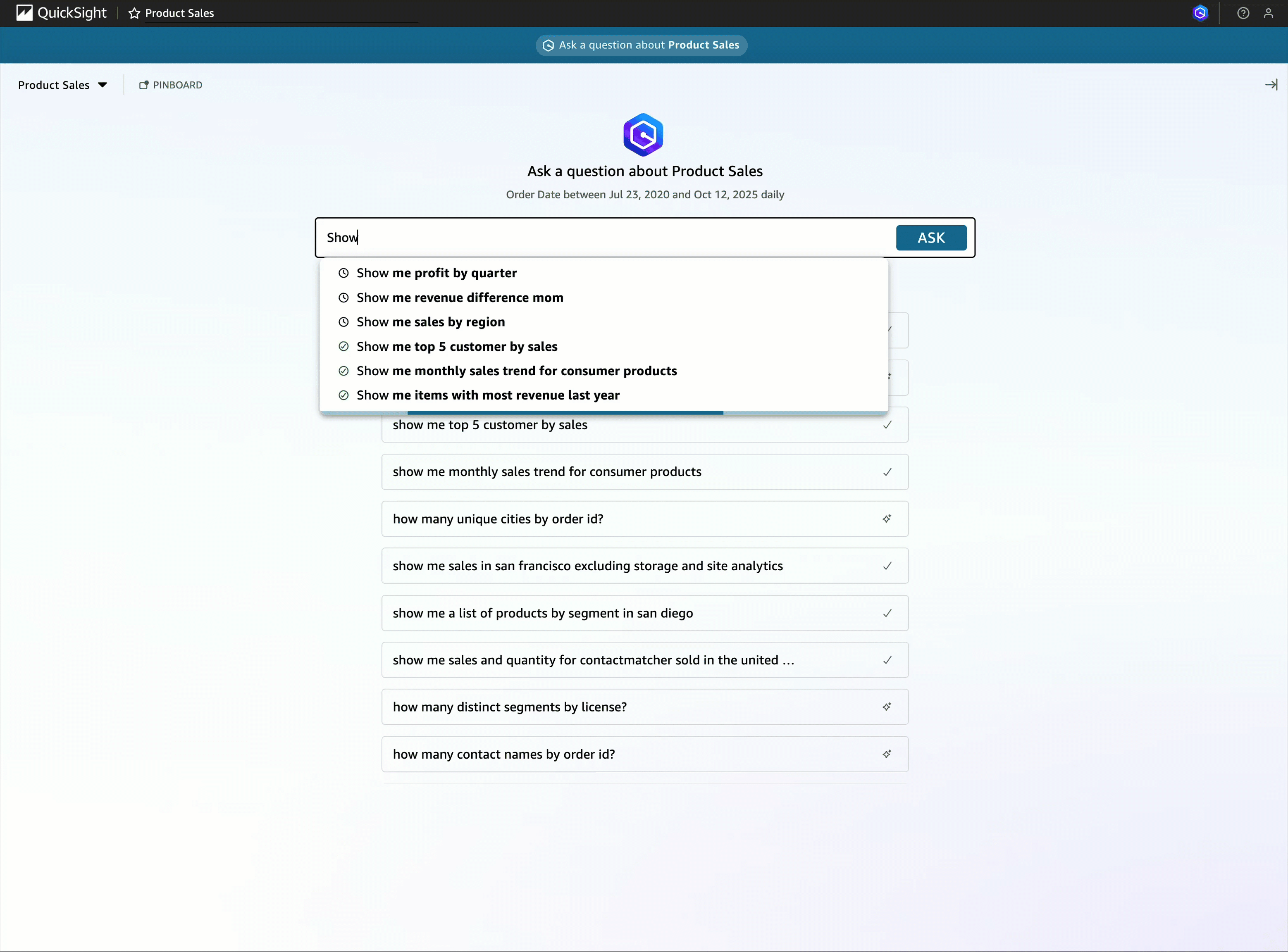 In this post, we walk through how to use Amazon Q in QuickSight to analyze sales performance using the built-in Product Sales topic, which includes fields like Sales, Profit, Region, Segment, and Order ID. This dataset helps demonstrate how Amazon Q can provide immediate insights into business performance across different regions, customer segments, and categories.