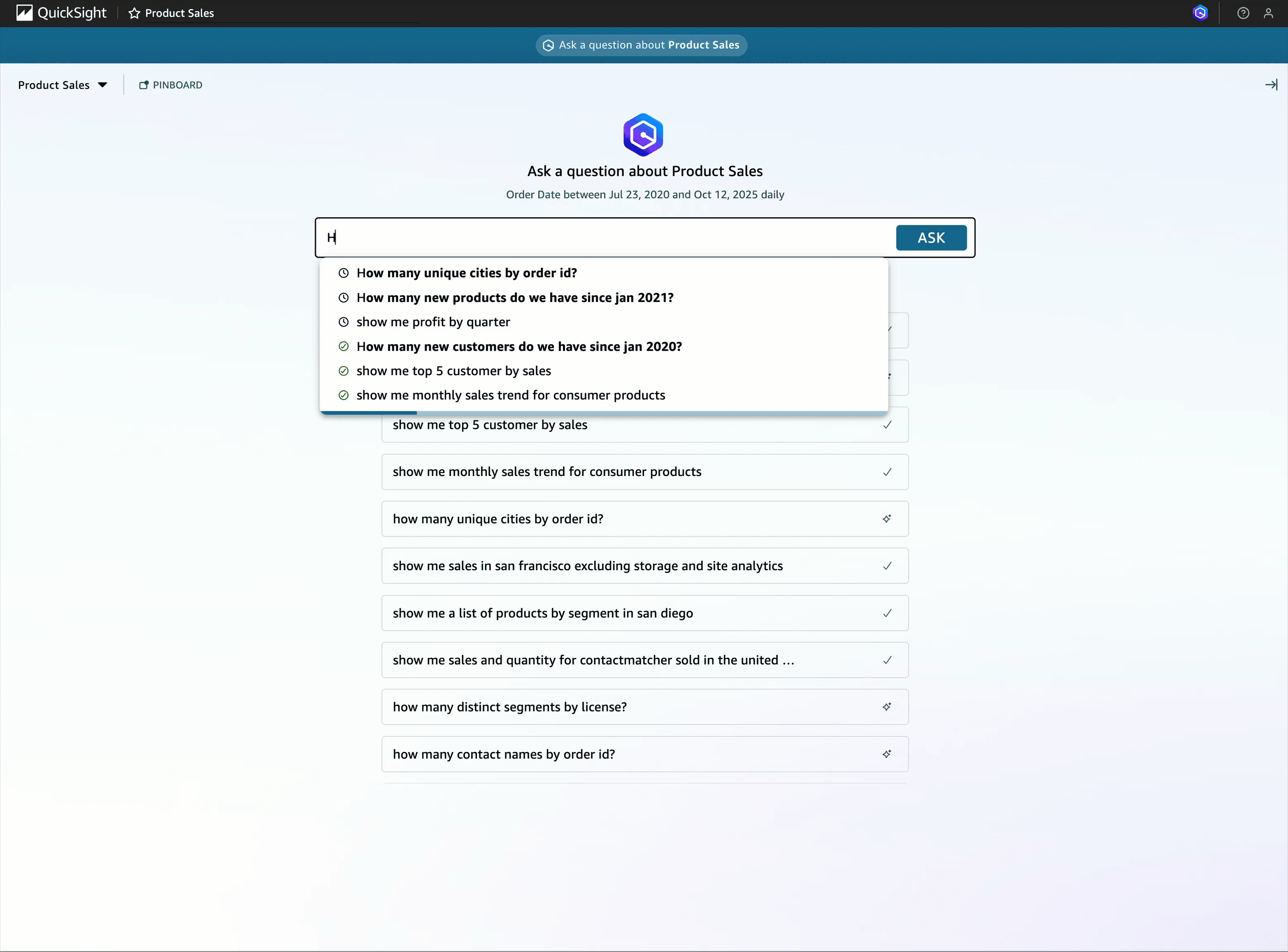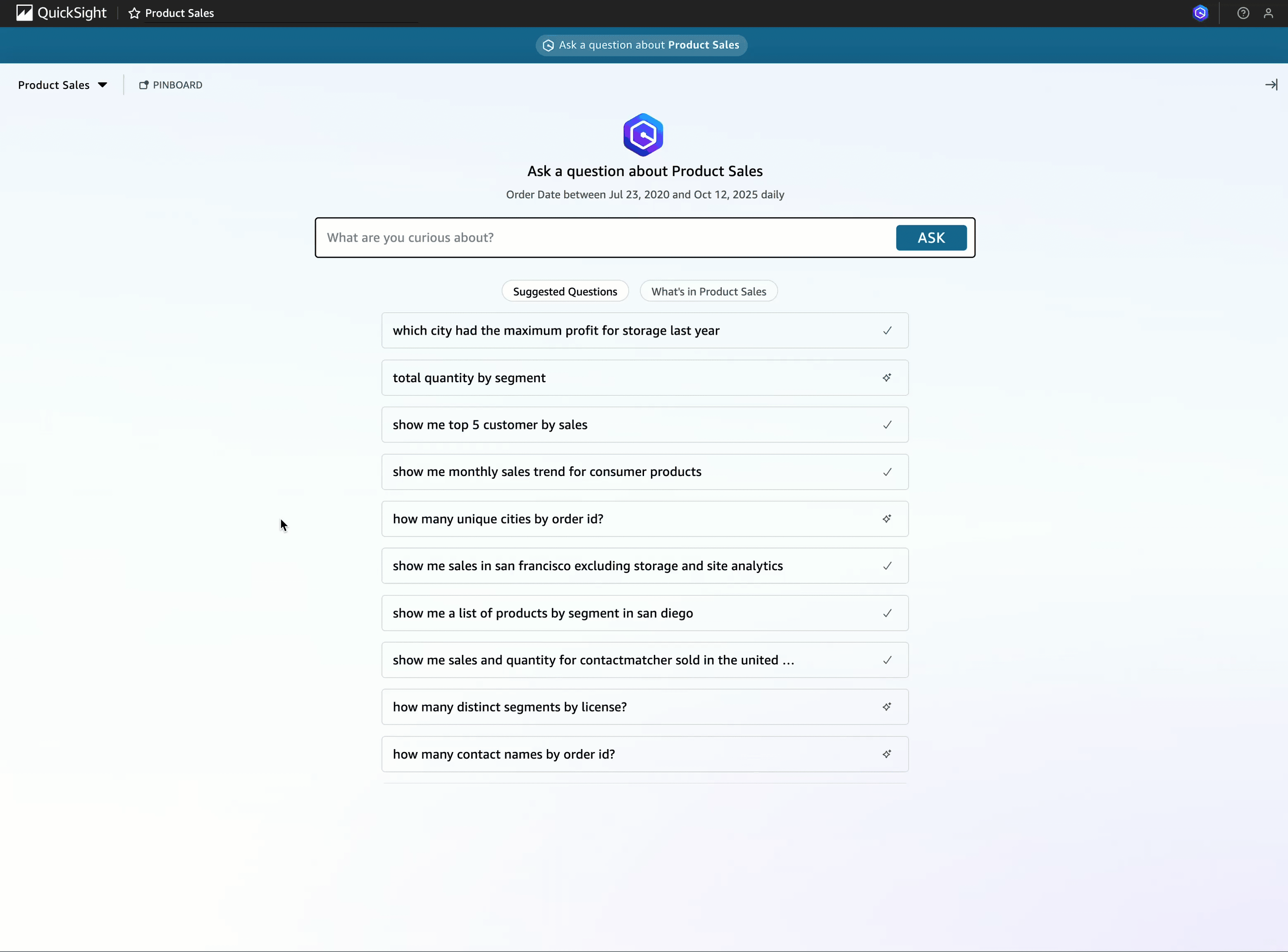 For example, when reviewing your Product Sales sample topic, Amazon Q in QuickSight might suggest the question “How many unique cities by order id?”. This question reveals geographic distribution and order density, which is helpful for assessing industry coverage or fulfillment strategy.