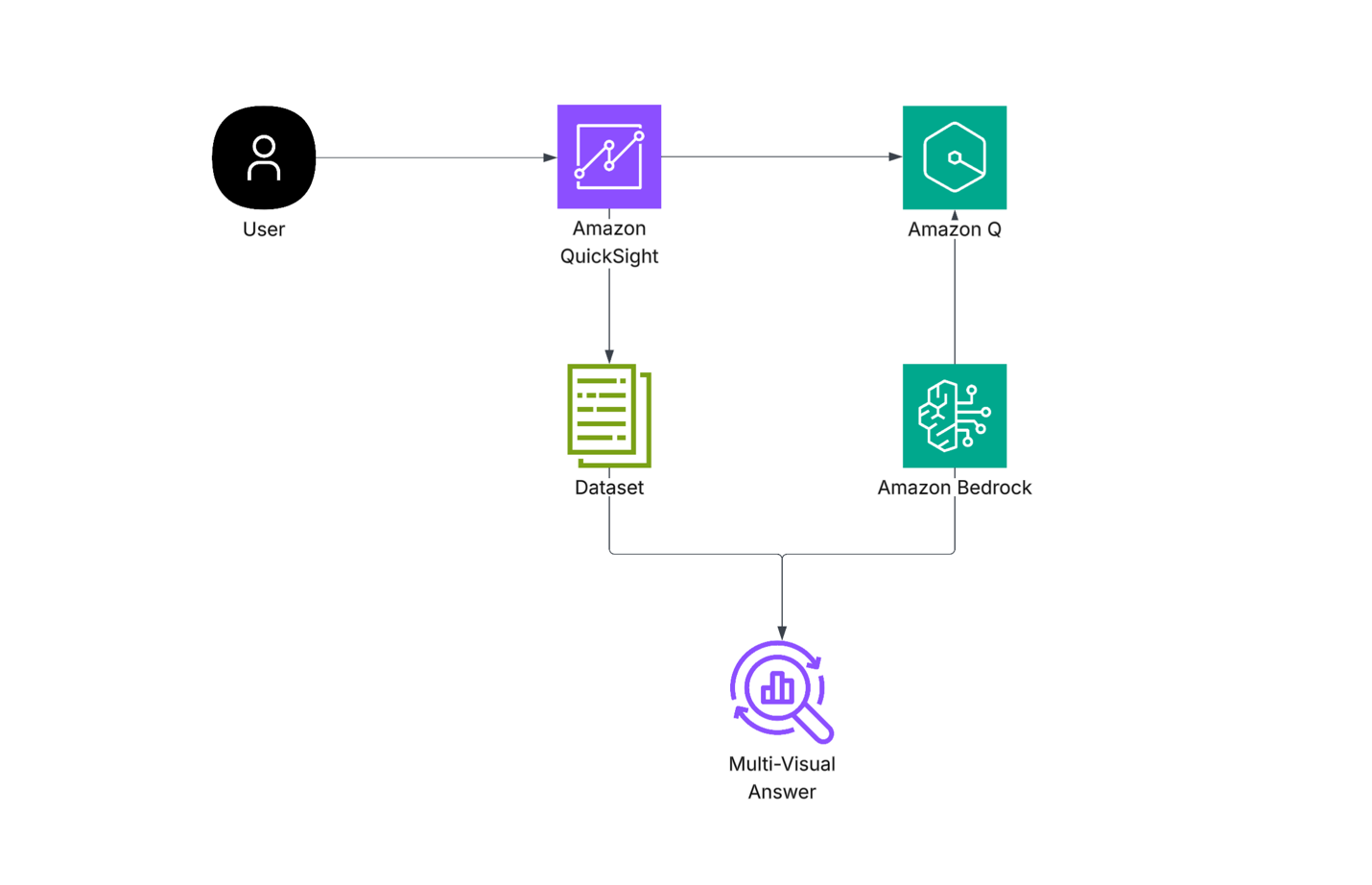 This solution enables business users to ask natural language questions directly in Amazon Q in QuickSight and receive real-time, multi-visual answers, without building dashboards or writing SQL. It combines intuitive BI exploration with foundation model (FM) reasoning through Amazon Bedrock, powering both Amazon Q in QuickSight topics and scenarios in the background.