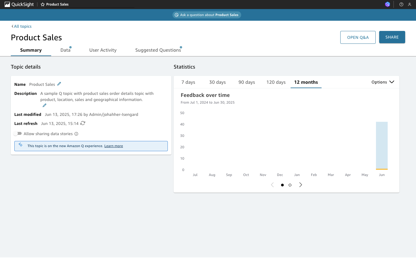 To use Amazon Q in QuickSight in a sales review meeting, you must first enable the built-in Product Sales topic. Follow these steps: