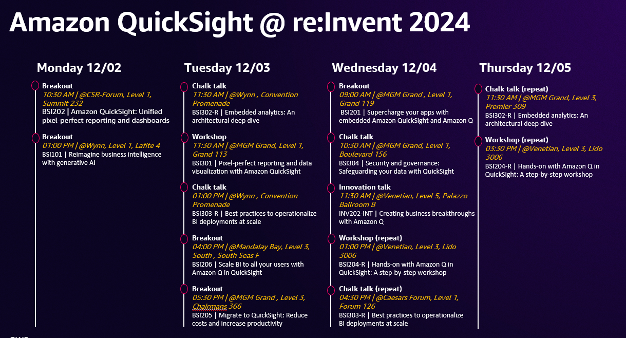 This post walks you through the details of all QuickSight related sessions and activities to help you plan your conference week accordingly. These sessions should appeal to data and analytics teams, product and engineering teams, and lines of business and technology leaders interested in modernizing their BI capabilities to transform data into actionable insights for all.