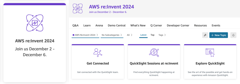 AWS re:Invent Corner is now live on the QuickSight Community! View the QuickSight session list, learn about events, and stay up to date on feature launches. After re:Invent, find and share QuickSight session recordings—all from one place.
