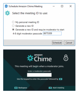 To schedule a moderated meeting, hosts or their delegates choose the new option Generate a new ID and require moderator to start, and assign a moderator passcode to the Chime meeting ID.