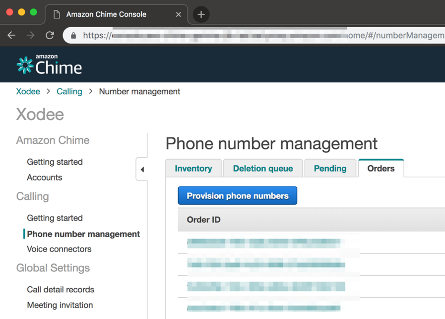 I login into the AWS Management Console and select Amazon Chime. Then I click the Phone number management tab under Calling, then the Orders tab, and then Provision phone numbers.