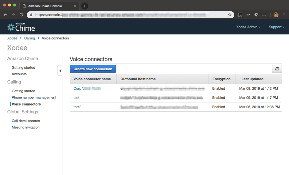 Now that I have a number, I can provision a Voice Connector. I start by clicking on the Voice Connectors tab and select Create new connection.