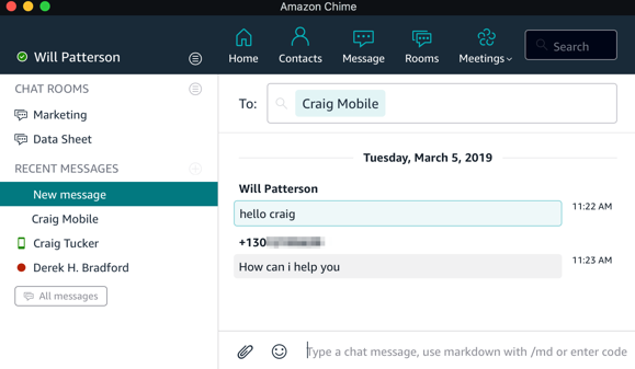 If the text messaging feature has been enabled and I need to send someone a text message, I can now do that right in the Chime app without having to switch to my mobile. Just like a regular Chime chat I select Message and choose a contact, in this case one with a phone number.