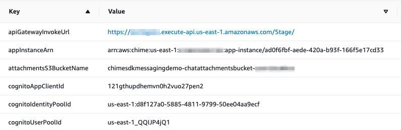 apiGatewayInvokeUrl,appInstanceArn,attachmentsS3BucketName,cognitoAppClientId,cognitoIdentityPoolId, andcognitoUserPoolId. Note these values for the demo app configuration in the next step.