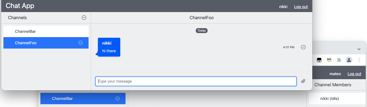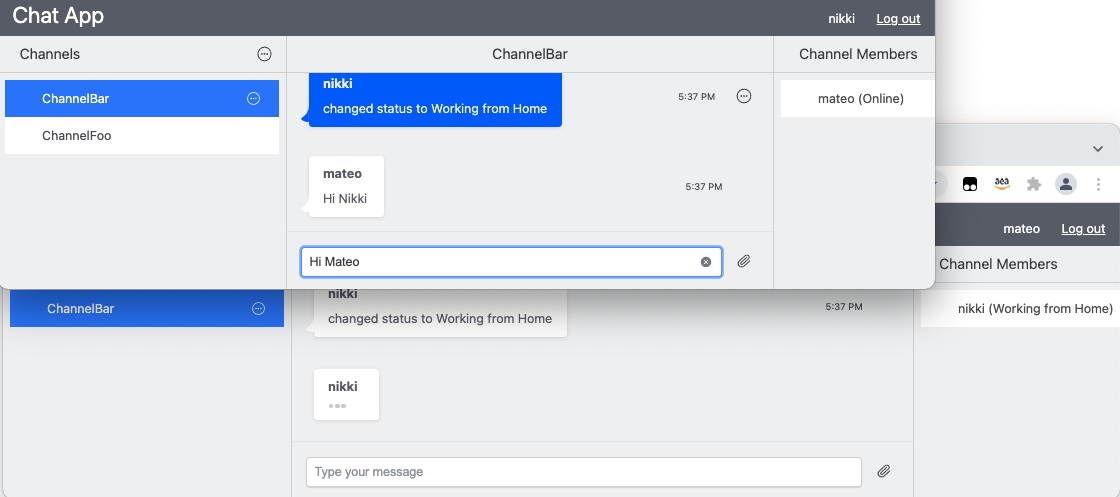 - Log out the same user, or simply close their browser tab. Notice their presence within the channel is unchanged.