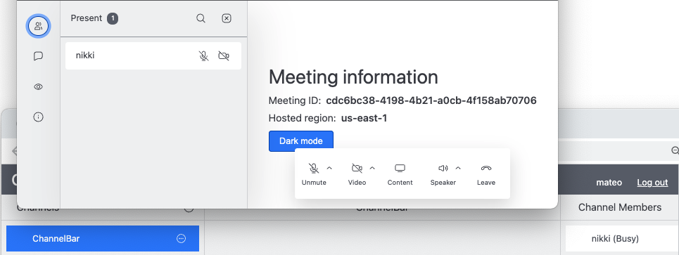 With the Amazon Chime SDK chat demo app, you can quickly experiment with various messaging features, such as, creating a channel and adding members, sending and receiving messages, and starting and joining a meeting within a channel. For this blogpost, the chat demo app has been updated to demonstrate how to build presence and typing indicator features within a channel for a messaging application.
