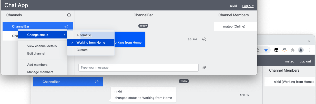 - Notice the channel presence status for that user is updated to the custom status provided.