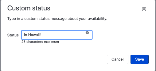 With custom presence, users can set their preferred status in a channel – e.g. “Working from Home” or “I’m in Hawaii.”