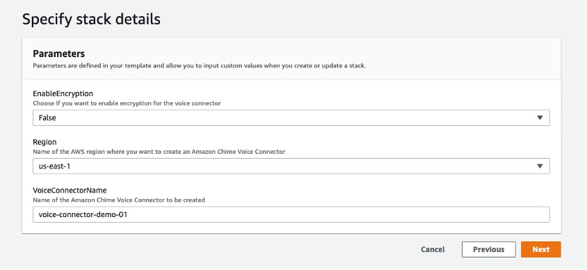 - Stack name – The name of the stack for creating an Amazon Chime Voice Connector. Enter ‘voice-connector-stack-01’.