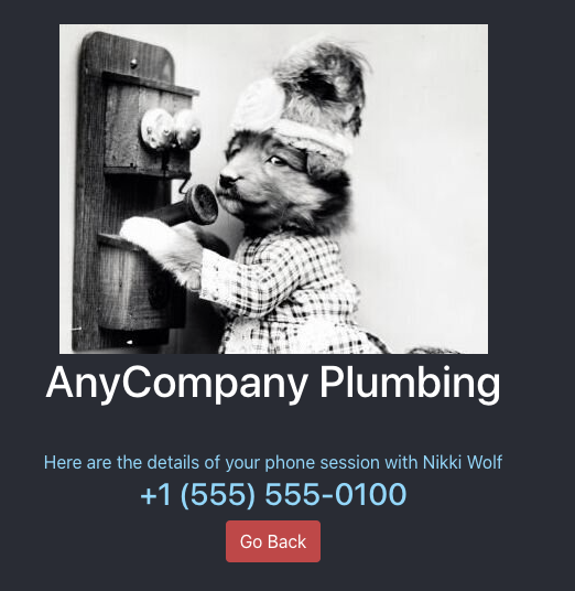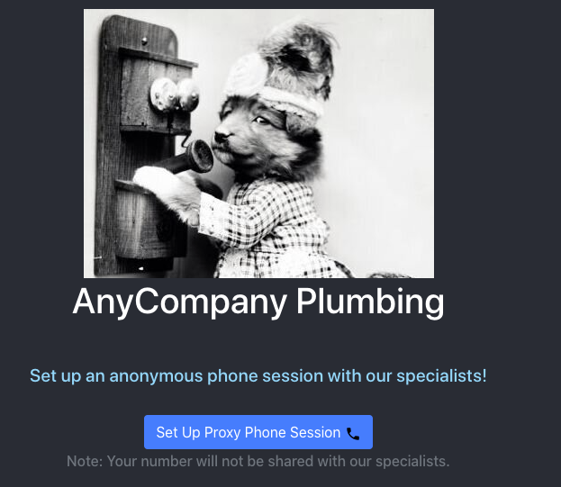 This section explains how to set up a proxy phone session app using a fictional example to see how a proxy phone session can be set up in the real world. AnyCompany Plumbing is a fictional company which provides plumbing repair, sewer and drain services, and water damage cleanup services to customers. You deploy a sample app called Puppies Plumbing Inc to schedule calls with plumbing professionals for consultation. When you set up a consultation with a plumbing professional, the app sets up a proxy phone session between you and the professional, and presents an anonymous phone number for the conversation. Once you dial the anonymous phone number, you are connected to an available plumbing specialist without revealing your real phone number.