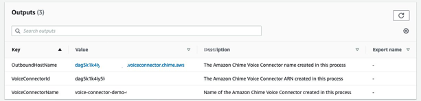 Creating the stack generates 3 outputs,voiceconnectorName, voiceconnectorId, and OutboundHostName, as shown in the following image. Have these values ready for the next step.