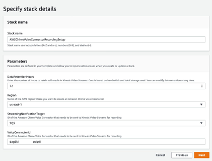 - Stack name – The name of the stack for creating an Amazon Chime Voice Connector. Enter