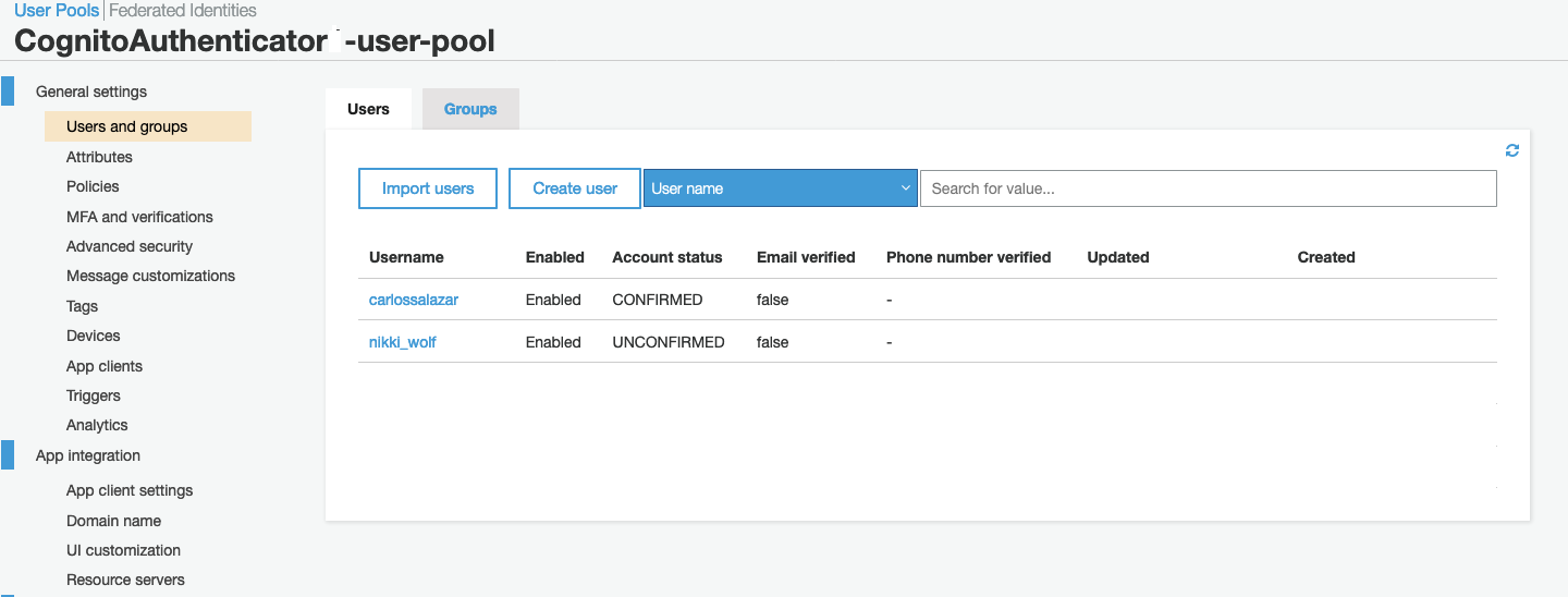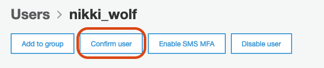 During user registration, a user is created in the secure Amazon Cognito directory you set up in Step 2. However, this user is in unconfirmed state after registration. To confirm the user, an administrator logs in to the Amazon Cognito directory (CognitoAuthenticator) and confirm the user by clicking on the username, and choosing Confirm User.