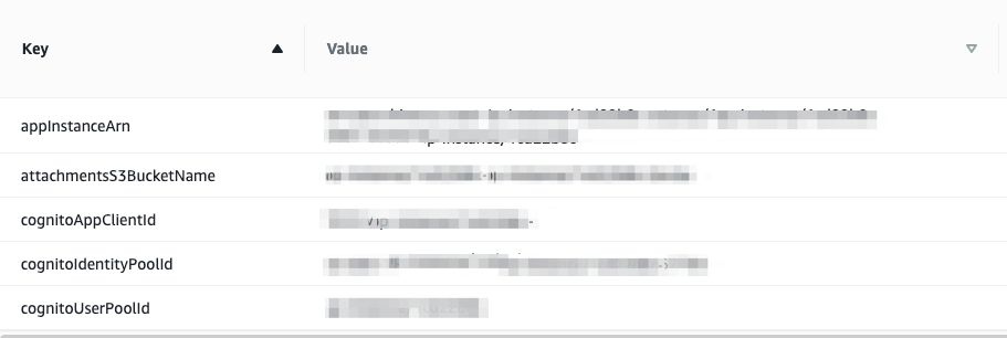 - Creating the stack generates 4 outputs- cognitoAppClientId, attachmentsS3BucketName, cognitoIdentityPoolId, appInstanceArn, and cognitoUserPoolId. Note these values for the demo app configuration in the next step.