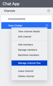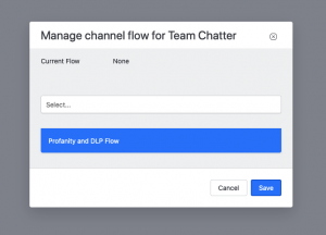 - The profanity and DLP Flow you created in Step 1 as part of the CloudFormation stack should be listed under the ‘Manage channel flow’ option on a channel. Enable moderation on a channel by choosing Manage channel flow from the channel options and select the Profanity and DLP flow.