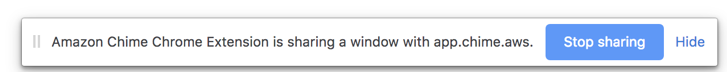 Before sharing content in the web application, attendees must install the Amazon Chime Screen share extension from the Google Chrome Web Store. When possible, they should download this extension before your meeting to lessen disruption. Otherwise, they are prompted to install it when they select the Start screen share option. After installing the extension, they must choose the Start screen share option again.