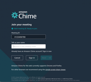 If you host meetings with attendees outside of your company, you know how disruptive it can be sometimes when your attendees have trouble joining your meeting. It might be because they are unfamiliar with your conferencing solution, or they join only to find that they cannot access critical features, like screen sharing. The Amazon Chime web application makes it more efficient to host and join meetings from any device with a supported browser. This includes devices running Linux or Chrome OS, without downloading or installing the Amazon Chime client. Amazon Chime’s web application prioritizes getting your attendees into your meetings quickly. Then once they have joined, it provides them a resourceful meeting experience that is complete with audio, video, and screen sharing. They can enjoy such features as notifications when meetings start, access to host controls, and the complete Amazon Chime chat experience.