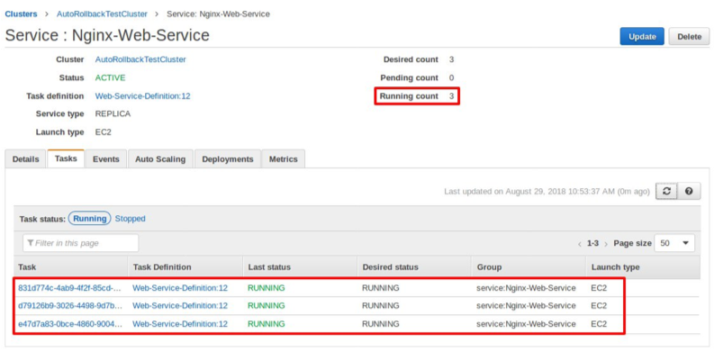 You can also verify in the service details that the service has been updated with the previous version of the task definition.