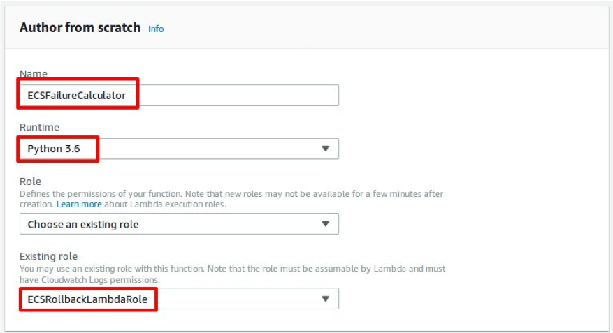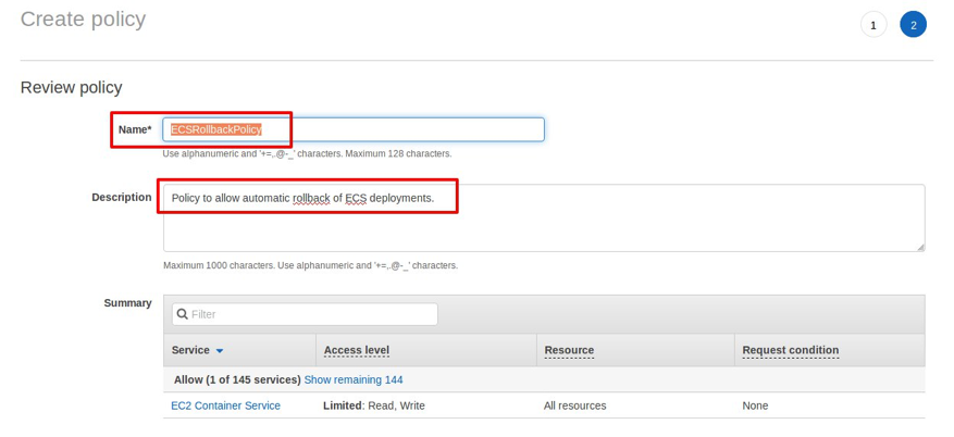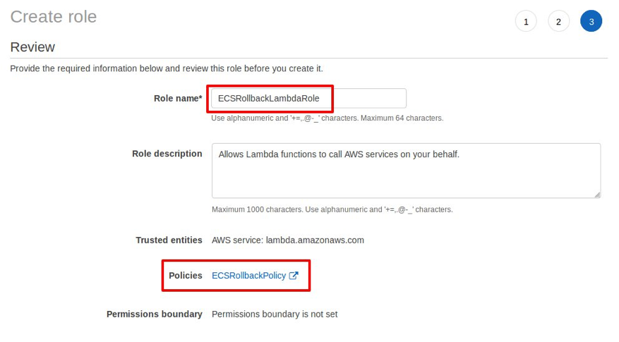 First, we create an IAM role for reading the event stream of the Amazon ECS service and rolling back any faulty deployments.