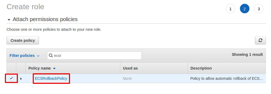 5. Under Attach permissions policies, select the ECSRollbackPolicy policy that you created.