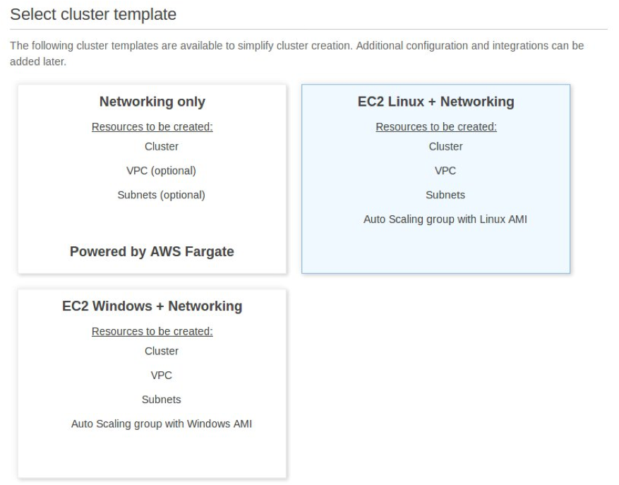 2. For Step 1: Select cluster template, choose EC2 Linux + Networking and then choose Next step.