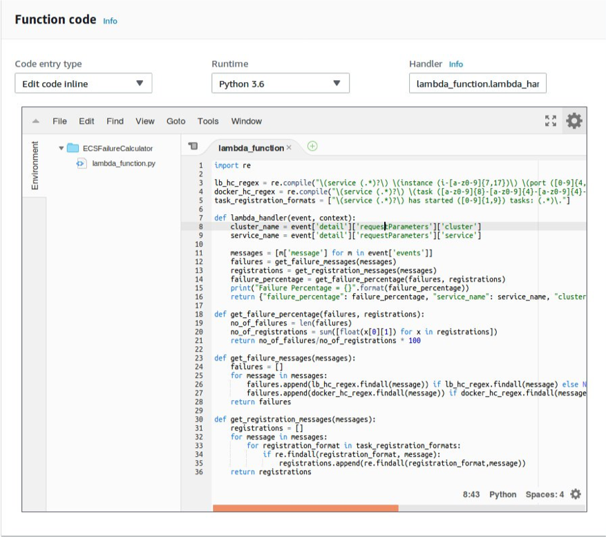 Next, we create a Lambda function that calculates the failure percentage based on the number of failed container health checks derived from the event stream.