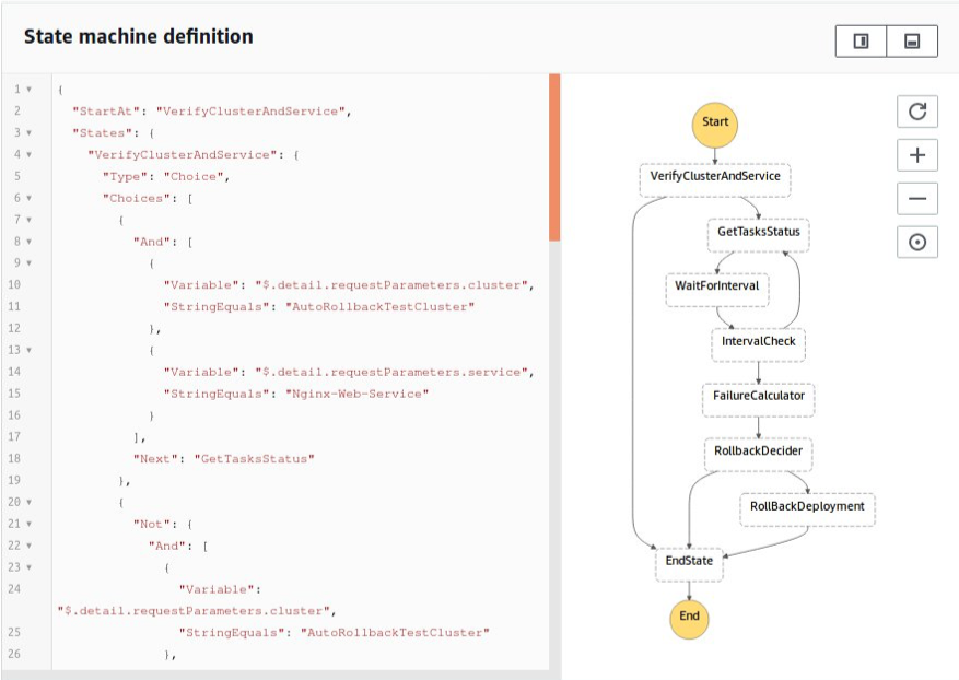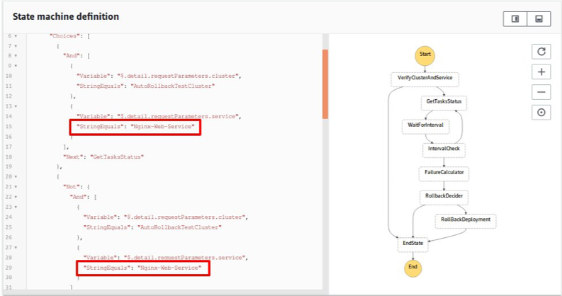 If you want to monitor all services and automatically roll back any Amazon ECS deployment in the cluster based on failures, modify the state machine definition to verify only the cluster name and to not verify the service name. To do this, remove the service name check in the definition, as shown in the following image.