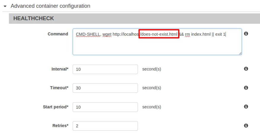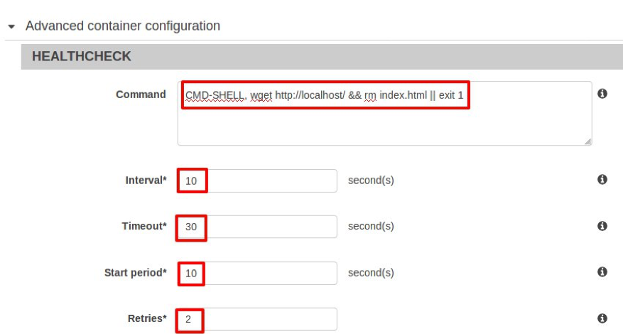 8. Under Advanced container configuration, enter the following information for Healthcheck: