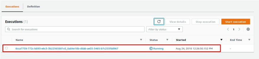 This service update triggers the CloudWatch rule, which in turn triggers the state machine. The state machine collects the Amazon ECS events for 300 seconds. If the percentage of errors due to health check failures is more than 10%, the deployment is automatically rolled back. You can verify this on the Step Functions console. On the Executions view, you should see a new execution that the deployment is triggering, as shown in the following image.