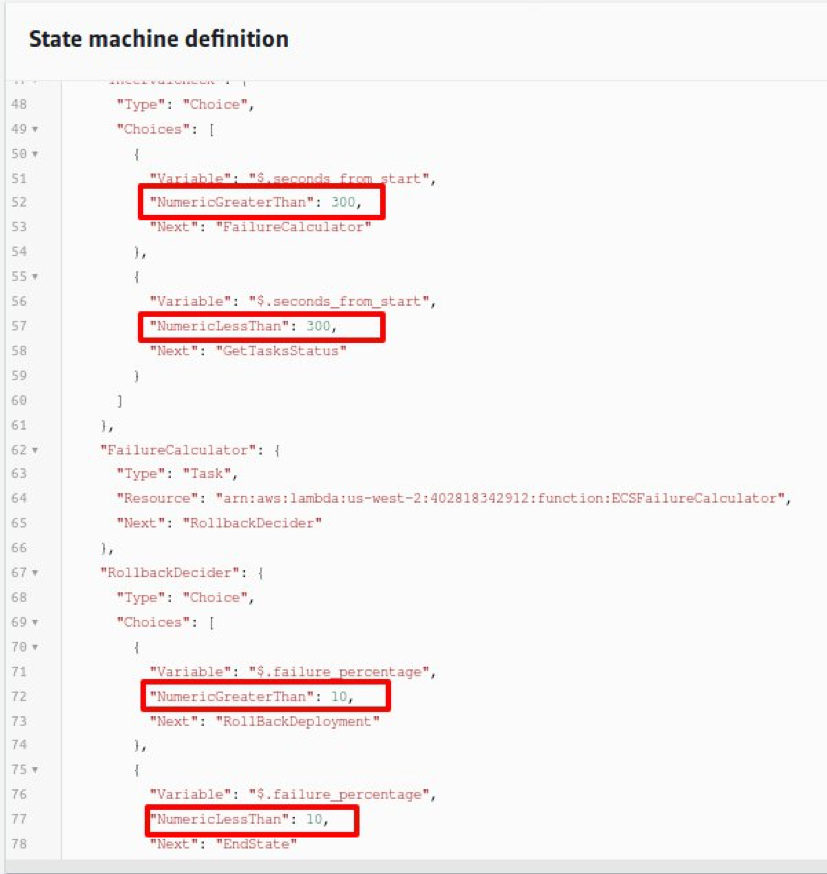 If you want to customize the duration for monitoring your deployments before deciding to rollback and the error percentage threshold beyond which a rollback should be triggered, modify the values highlighted in the following image of the state machine definition.